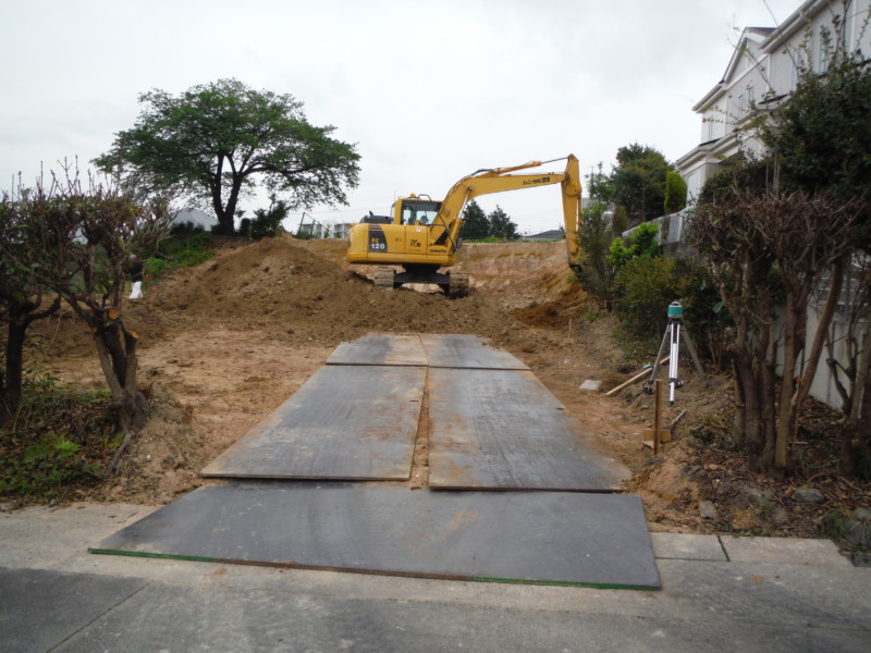 まずは作業車が入れるように鉄板を敷きます。 すきとり工事開始です。不要な土を削り取っていきます。