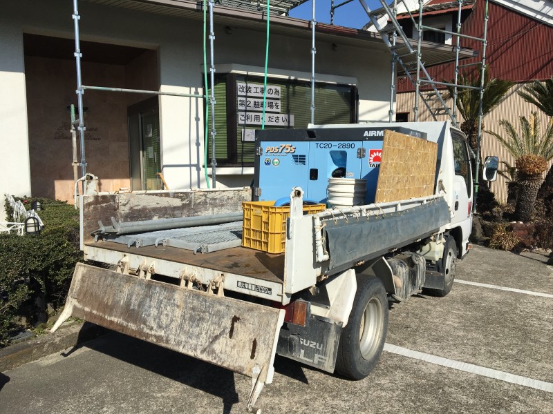 コンプレッサーを使用し、2階までエアーホースを伸ばしていきます。