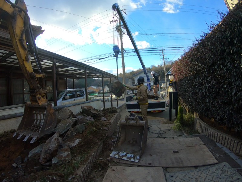 割れた庭石から1つずつ、ユニックで吊って積み込みます。