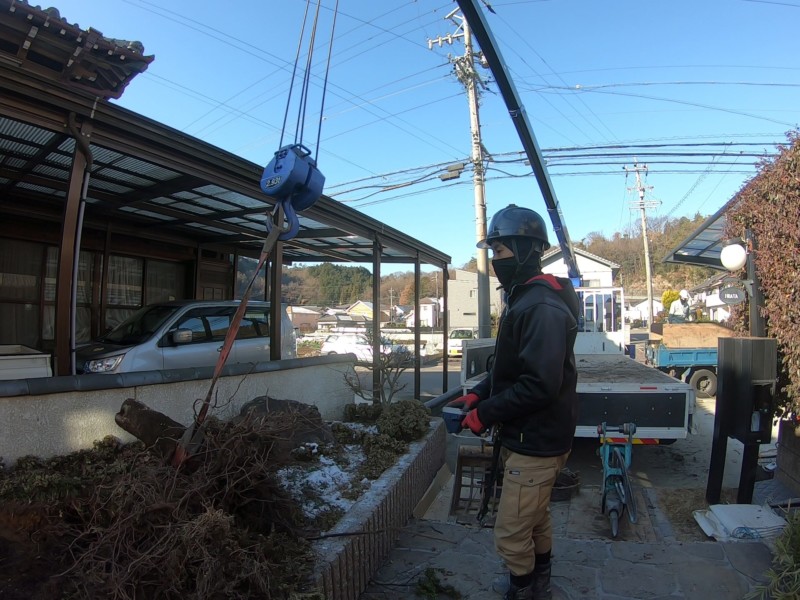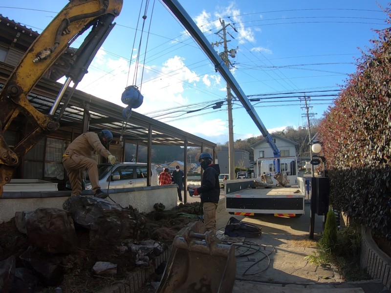 庭石の数が多いので時間がかかってしまいますが、カーポートや門など周囲に注意しながら吊っていきます。