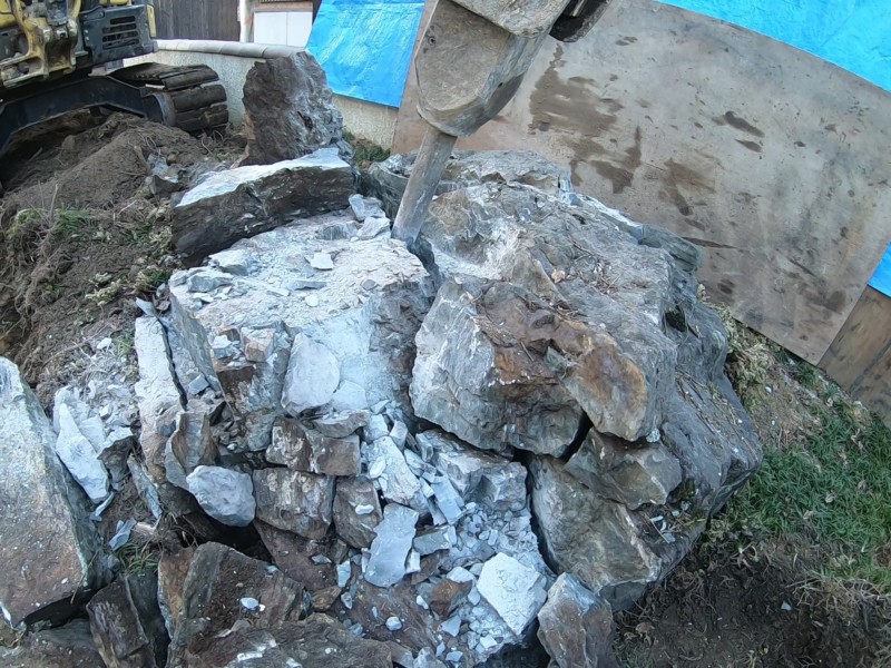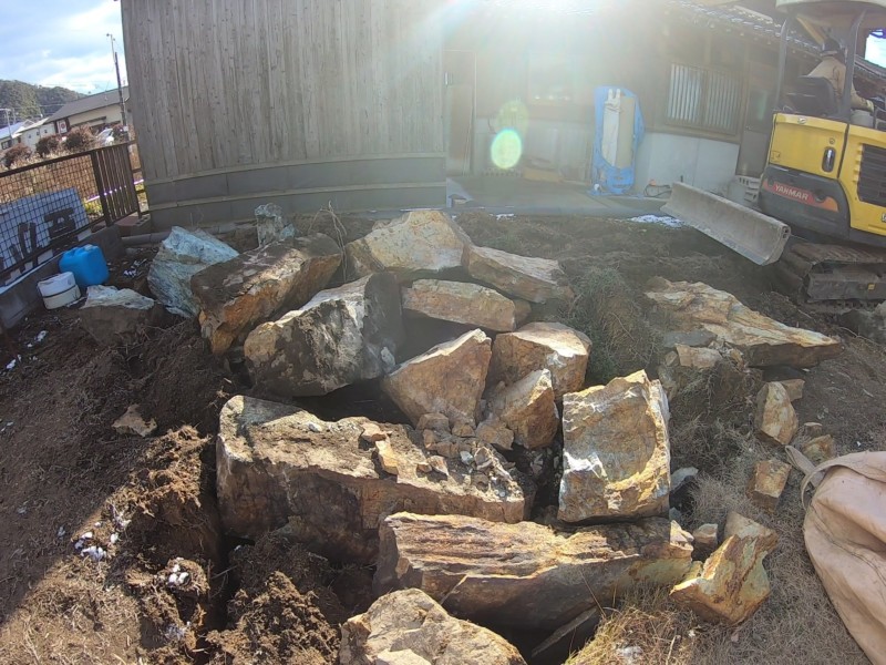 大きな庭石は積み込みが大変なので、割って小さくする予定です。