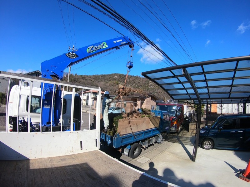 いったんユニックの荷台に載せて、のちほどダンプへ積み替えしました。