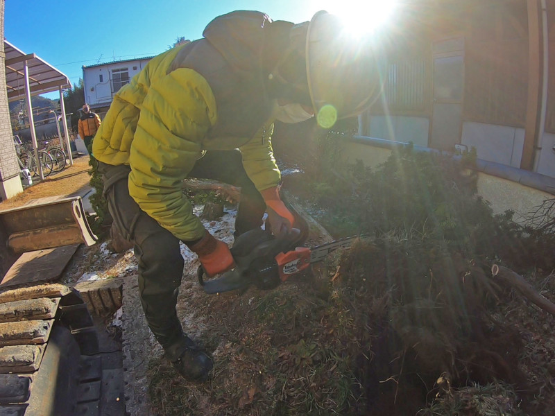 大きい庭木はチェンソーで切りながら、その後に伐根もしていきます。