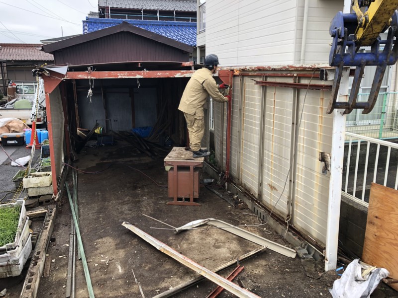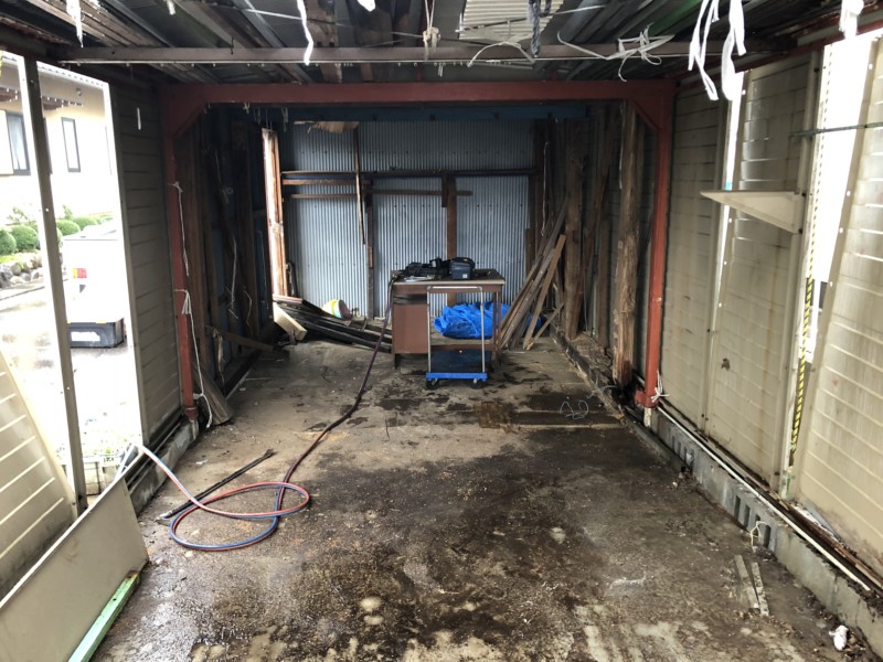 古くなった鉄製の車庫はシャッターが壊れてしまい車を入れることができないので、解体してキレイに戻すこととなりました。