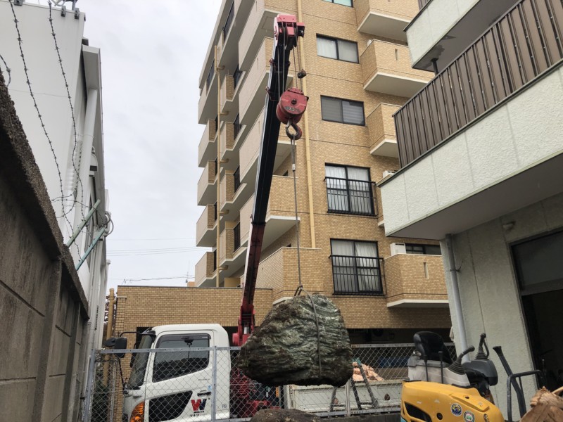 庭石・庭木・残土を撤去してクレーンで吊る