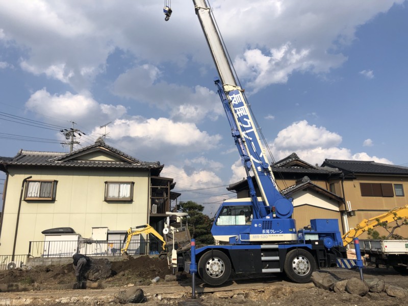 庭の垣根やガレージ、駐車車輌があり重機などが入れないので、クレーン作業で吊り上げる方法を採用しました。クレーン作業では、電線や電柱の支線などにも注意し慎重に作業を進めていきます。