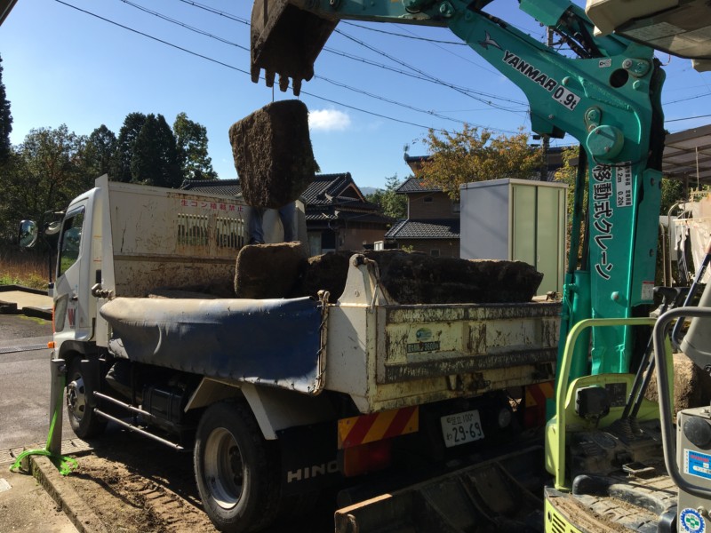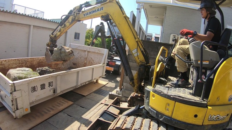 人がギリギリで通れる程度の非常に狭い場所ある庭石を、マメ重機で引きずりだしました。積み込み作業に重機もクレーンも使えないので、人力で吊り上げ、軽トラに乗せて搬出しました。
