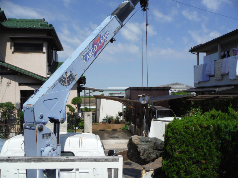 庭石の撤去工事は駐車場やお庭をキズつけずに施工しなくてはいけないので、限られた条件での作業となります。今回のように玄関前の場合は重機が使えないので、クレーン車で対応しました。