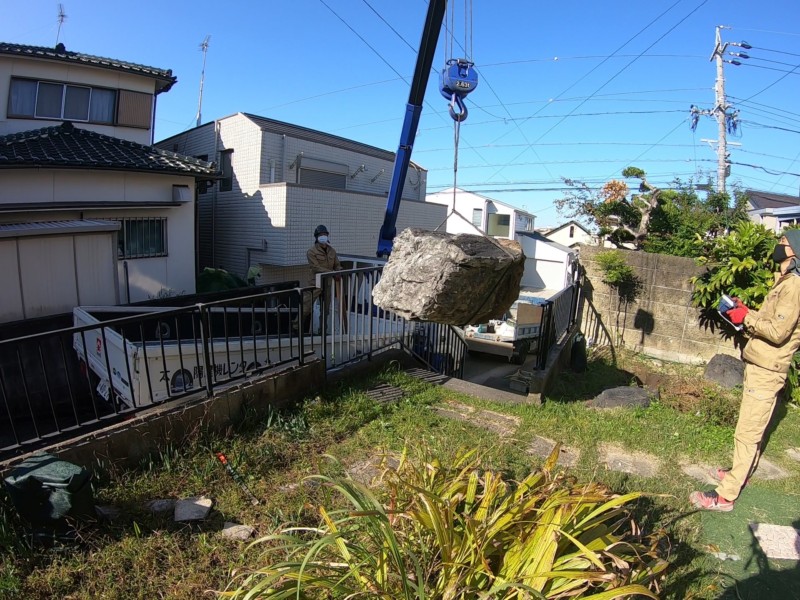 庭石は非常に重量物のため、基本的に重機やクレーンを使って動かします。そのため、それらの機械が入って作業できる環境かどうかがとても重要です。処分したい庭石の近くに重機やクレーンが入ることできれば、比較的に撤去作業は順調にいくケースが多いです。