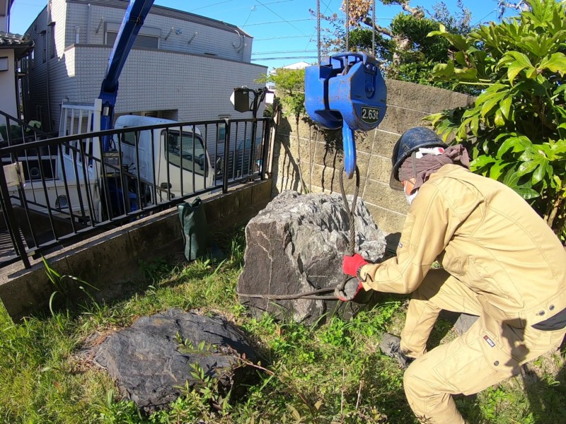 大きな庭石を大型クレーンで吊って撤去する