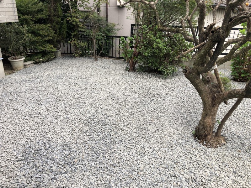 「お庭が荒れてキレイにしたい」というご相談いただきました。庭石や残土を撤去して、手入れが楽になるように雑踏対策で防草シートを敷き、白い化粧砂利を敷きならしました。お庭が明るくなり、奥様にも喜んで頂けました。