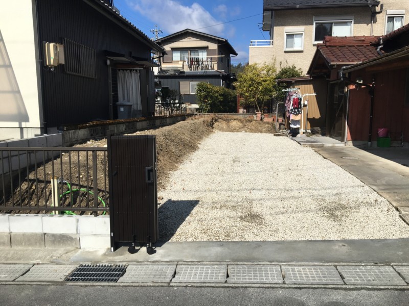 中古住宅を買われたお客様からのご依頼で、『荒れた庭をキレイに撤去して、駐車場として広げたい』というご要望です。駐車場の整備とともに、庭と駐車場との間にブロックとフェンス、ポストを設置しました。