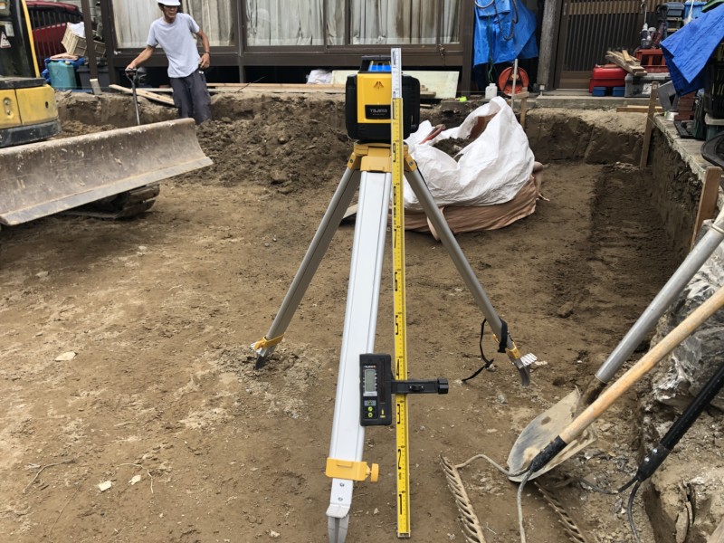 ここからは駐車場づくりです。所定の高さに合わせるようにレベル計で計測していきます。