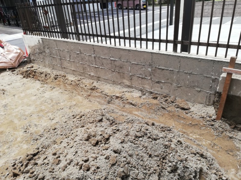 庭と駐車場の高低差を納めるために土留めブロックを設置します。