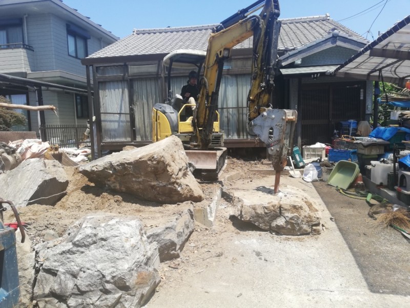 このままでは庭石が大きすぎて積み込みしづらいので、砕いてサイズを小さくします。