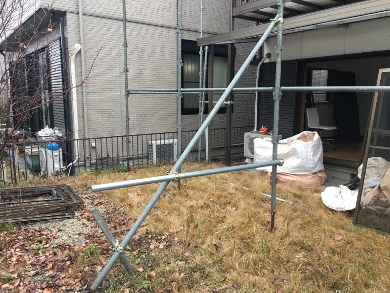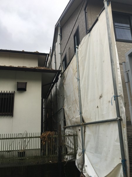 住宅地なので、隣地の方へ粉塵が飛散しないようしっかりシート養生をします。