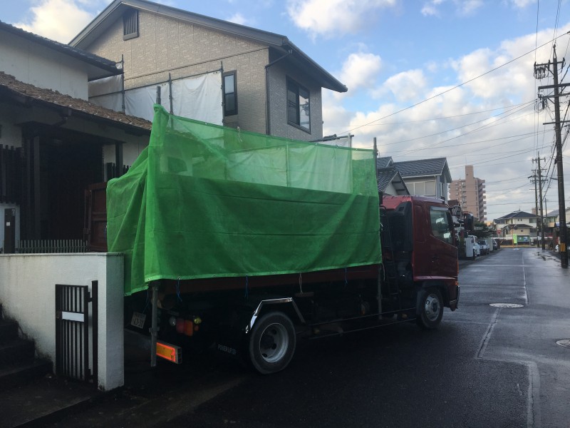瓦材は屋根上から投げ入れますが、こちらも飛散しないようダンプ周辺を囲いこみます。