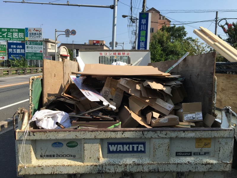 現場で仕分け作業をしながらの撤去搬出です。まずは木、紙類で1車です。