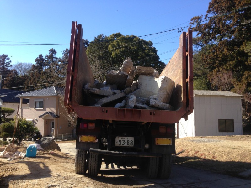 木造住宅とは言っても、基礎はコンクリートで造ってあります。 そのため、基礎の解体は作業が大変です。 さらに、建物の基礎コンクリートには補強のために鉄筋が入っています。 解体の時には、その部分までも壊さなければなりません。 しかし、ここで重機が登場すればまさに「100人力」です。 本来なら大変なコンクリートの解体工事もスピーディーに進みます。 廃材をまとめて搬出します。 コンクリート基礎もバラバラになって搬出されました。 住宅の廃材は大量に出ますし重量もあります。 重機が使えてダンプの乗り入れが簡単に出来ると、搬出作業の効率も違って来ます。お客様の感想